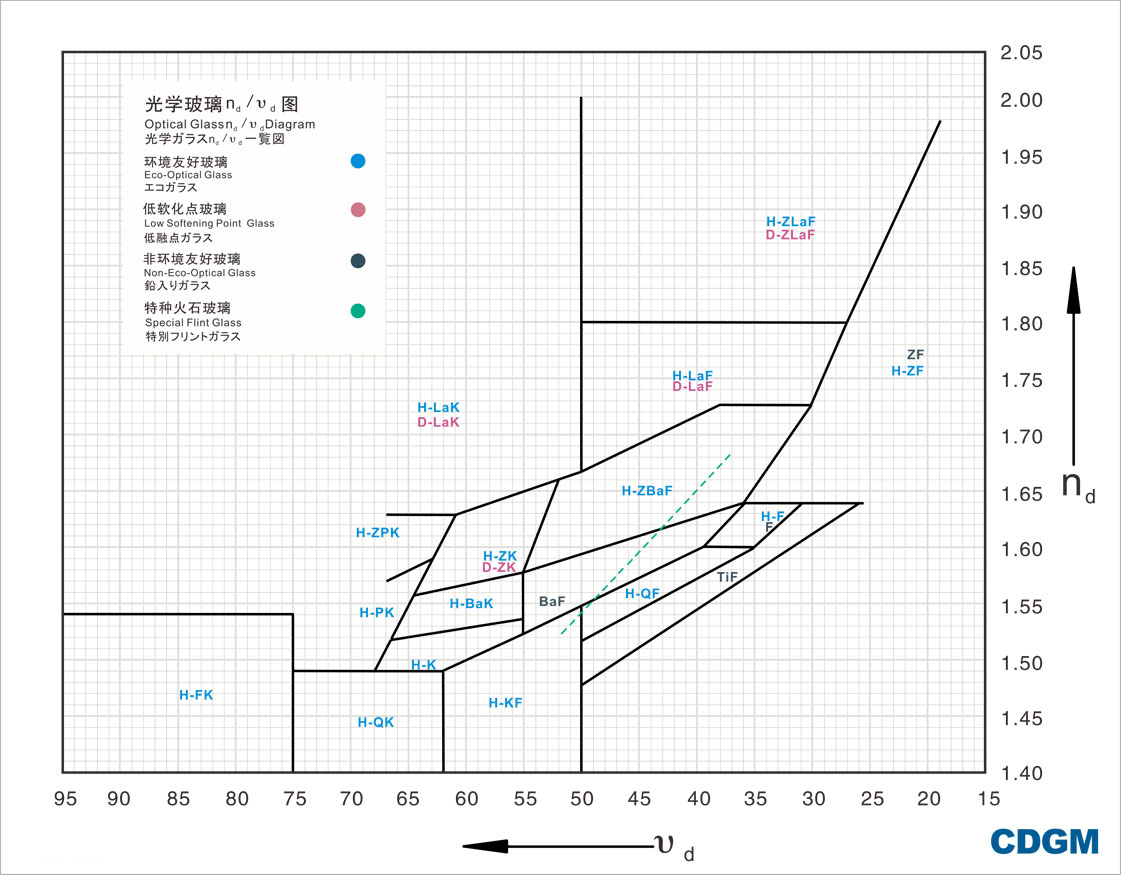 成都光明各牌号光学玻璃的折射率和色散图