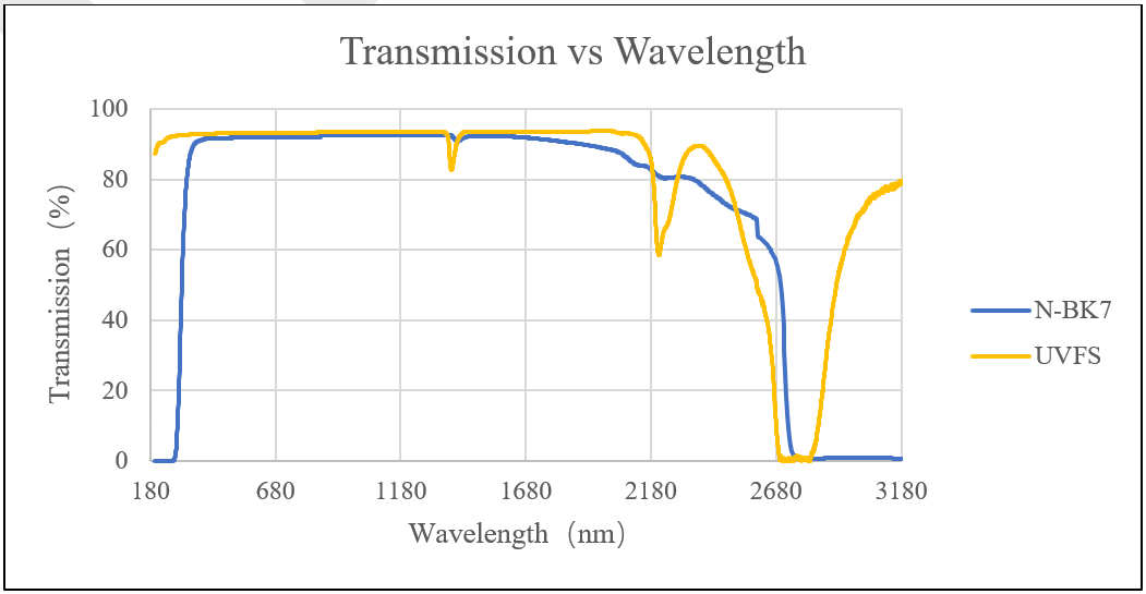 现在光学玻璃的生产厂商,主要有德国的肖特(SCHOTT)、美国的康宁(Corning)、日本的小原(OHARA)、国内的成都光明(CDGM)。在紫外波段我们常用的光学玻璃有紫外熔融石英(UVFS),常用的石英材料有国内的JGS1、JGS2、JGS3,Corning7980以及小原的高质量石英玻璃(SK-1300、SK-1310、SK-1320L、SK-1321等),我们的光学元件一般采用的是JGS1,其在180nm开始具有较高的透过率。Corning7980的均匀性好、气泡杂质含量少,所以多用于激光元件中,可以提供更高激光损伤阈值。可见光及近红外波段,常用的光学玻璃材料有肖特的N-BK7、浮法玻璃B270、成都光明的H-K9L等。N-BK7和H-K9L具有相似的性质,可以互相代替。它们在可见光和近红外(350 nm - 2.0 µm)提供高透过率。H-K9L精退火光学玻璃是我们高质量光学元件中最常用的玻璃。H-K9L精退火光学玻璃是一种硬质玻璃,能够承受多种物理和化学刺激。它比较耐刮而且耐化学品。由于气泡少、杂质含量低,因此它很适合制造精密透镜、窗口片、棱镜等元件。