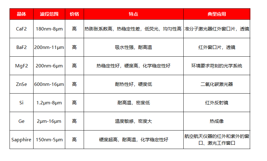 ◆ 常见的紫外、红外晶体材料有:石英(SiO2)、萤石(CaF2)、氟化锂(LiF)、岩盐(NaCl)、硅(Si)、锗(Ge)等。